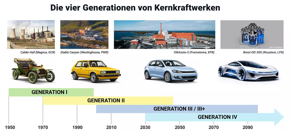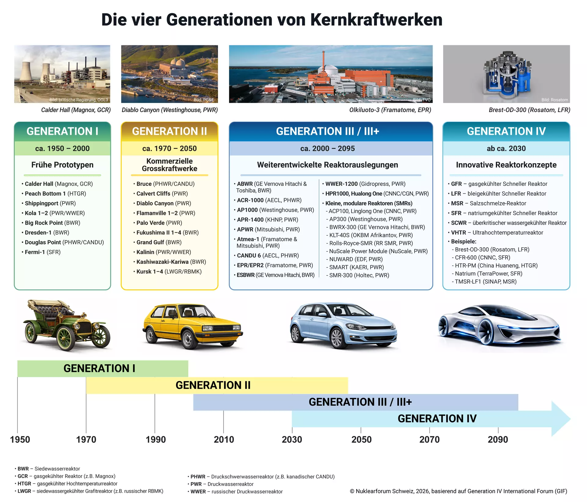 Für morgen stehen die kleinen, modularen Reaktoren (Small Modular Reactors, SMRs) in den Startlöchern, von denen schon Prototypen und Demonstrationsanlagen in Bau oder sogar in Betrieb sind. Sie umfassen sowohl weiterentwickelte Leichtwasserreaktoren der Generation III+ (siehe Multimedia-Dossier «Small Modular Reactors – Vielfältige Entwicklungen mit neuer Dynamik») als auch fortgeschrittene Konzepte, darunter auch Reaktoren der vierten Generation.